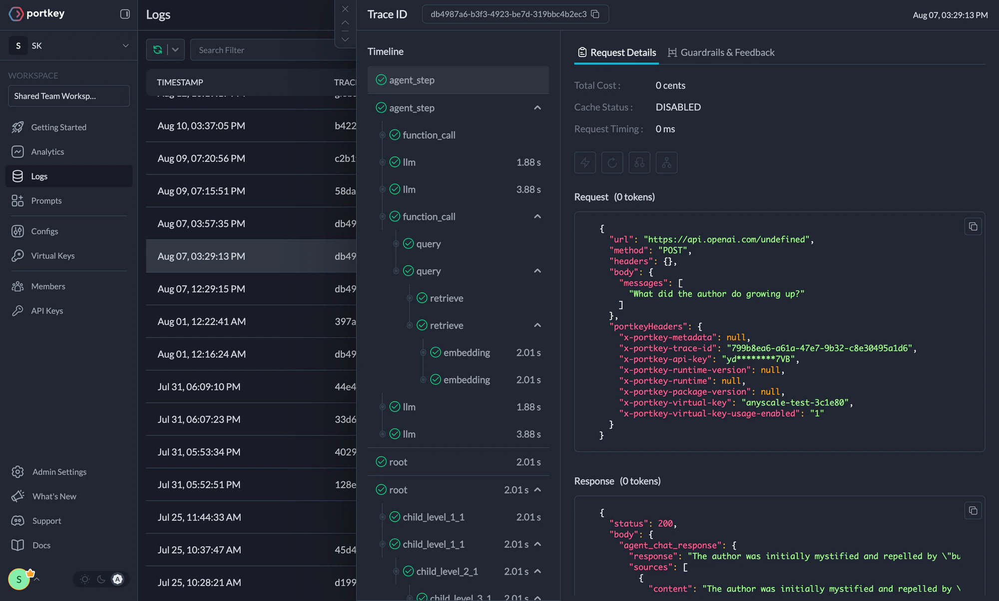 Agent runs are complex. Logs are essential for diagnosing issues, understanding agent behavior, and improving performance. They provide a detailed record of agent activities and tool use, which is crucial for debugging and optimizing processes. Portkey offers comprehensive logging features that capture detailed information about every action and decision made by your AI agents. Access a dedicated section to view records of agent executions, including parameters, outcomes, function calls, and errors. Filter logs based on multiple parameters such as trace ID, model, tokens used, and metadata.