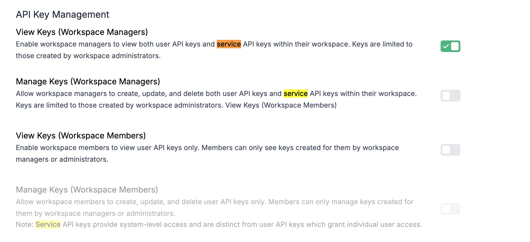 Manage Keys (Workspace Managers)Allow workspace managers to create, update, and delete both user API keys and service API keys within their workspace. Keys are limited to those created by workspace administrators.